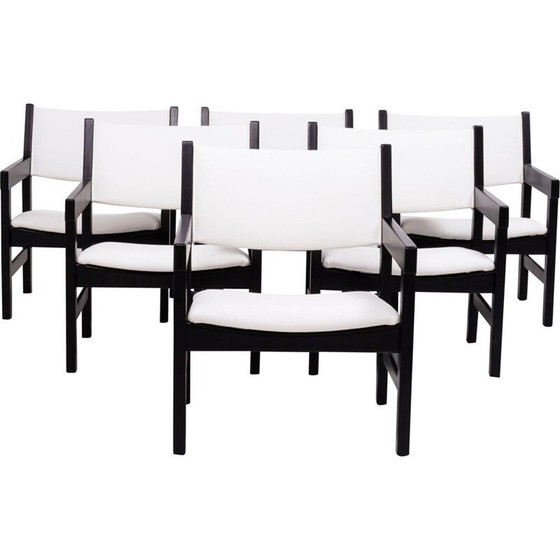 Dotées d'un piétement et d'accoudoirs anguleux en hêtre peint en noir, ces chaises récemment restaurées sont dotées d'une assise et d'un dossier rembourrés qui ont été récemment recouverts de similicuir blanc.