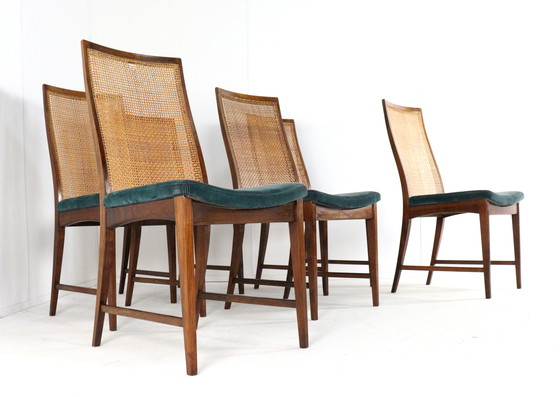 Cet ensemble de six chaises est un bel exemple de design moderne du Mid Century avec une touche classique.