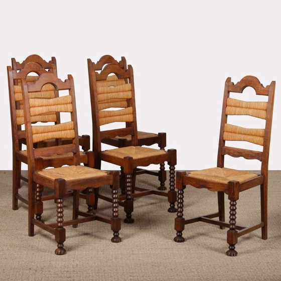 Cet ensemble de six chaises est une fabrication française des années 1940. La structure est réalisée en chêne massif et présente un travail soigné avec des éléments tournés. Les assises et dossiers sont paillés. Ces chaises sont conservées dans un bel état d’origine et présentent une patine homogène.