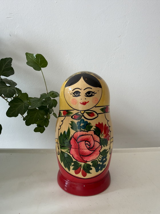 Adorable ensemble de poupées russes en bois, les Matriochka, ornées de fleurs peintes à la main en rouge et vert. La plus grande présente une grande rose sur le devant, un fond jaune et des détails de cheveux noirs. Les poupées, de tailles décroissantes, s'emboîtent parfaitement les unes dans les autres. Q55