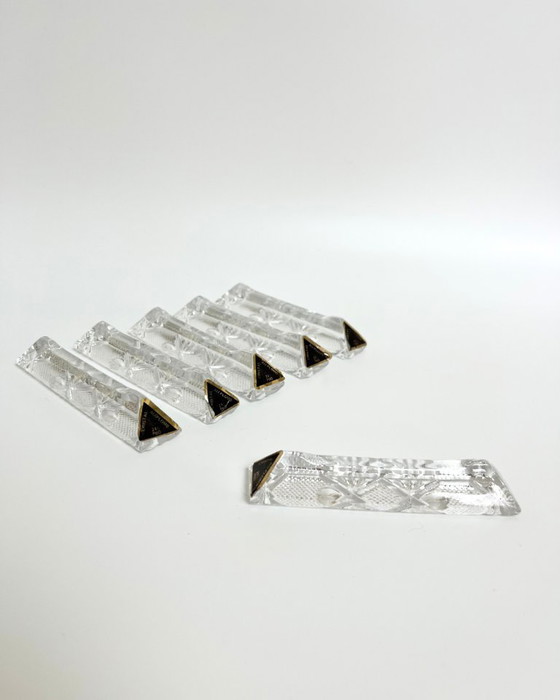 Élégant ensemble de six repose-couteaux vintage en cristal à 24 % de plomb, taillés en une raffinée forme pyramidale.