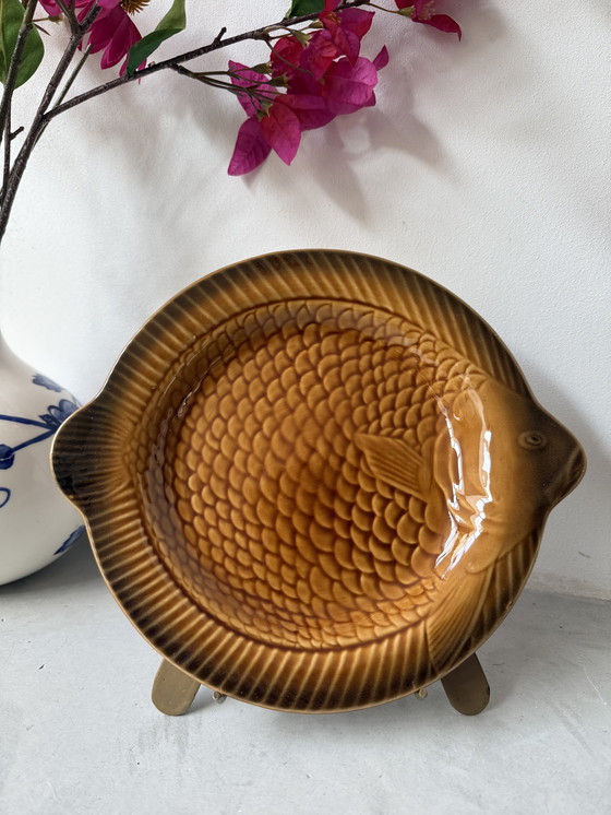 Chaque assiette est subtilement embossée en forme de poisson, avec une glaçure chaude brun caramel.