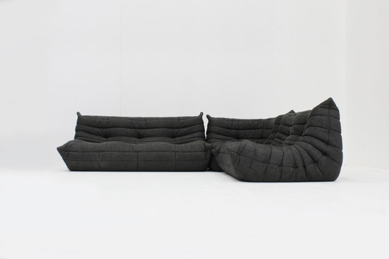 Canapé Togo vintage original de Ligne Roset, conçu par Michel Ducaroy dans les années 1970. Cet ensemble comprend un canapé 2 places vintage, un canapé d'angle et un canapé 3 places de 2007. Magnifique tissu noir et gris Ligne Roset. Les canapés sont en bon état, avec de légères traces d'usure liées à leur âge.