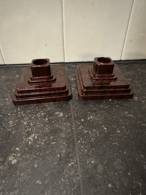 Sublimez votre intérieur avec cet exquis ensemble de bougeoirs en bakélite, véritable témoignage de l'élégance intemporelle de l'Art déco. Fabriqués en bakélite de haute qualité, ces bougeoirs arborent une riche teinte brune qui apporte chaleur et raffinement à toute pièce.