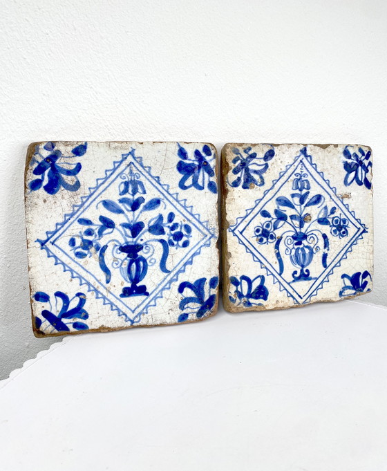 Lot de deux carreaux hollandais anciens traditionnels bleus de Delft, ornés de magnifiques motifs floraux peints à la main. Vendus par paire. La faïence bleue de Delft, aussi appelée faïence de Delft, est une forme d'art céramique traditionnelle néerlandaise née à Delft au XVIIe siècle. Aujourd'hui, ces carreaux blancs et bleus sont des objets de collection réputés. Dimensions : environ 12,5 x 12,5 x 0,7 cm.
