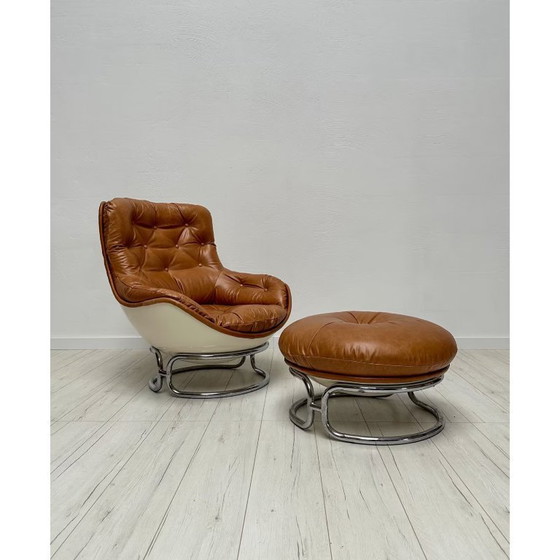 Magnifique ensemble de fauteuil et ottoman "Karate Chair" par Michel Cadestin pour Airborne, France, années 1960. Coque en fibre de verre blanche sur une structure en acier tubulaire. Revêtement professionnel en cuir de haute qualité cognac/marron. Design iconique et intemporel avec un grand confort d'assise. La coque du siège et la structure en acier tubulaire présentent des signes d'utilisation et de patine liés à l'âge.