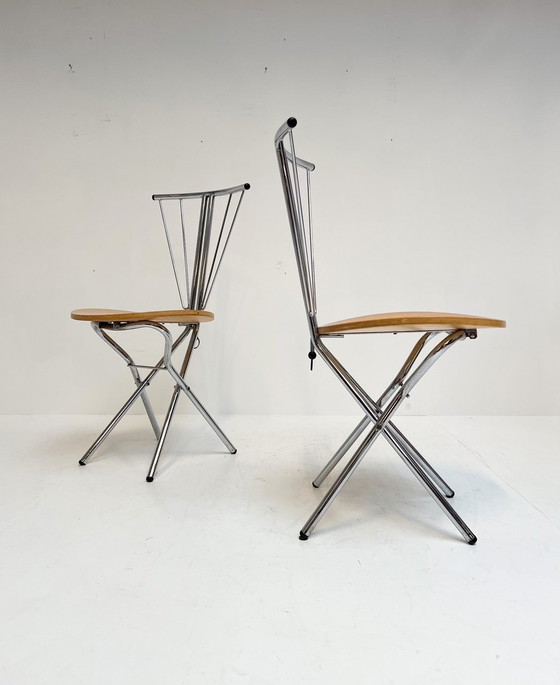 Ensemble de chaises pliantes La Palma (2), années 1980 Ensemble de chaises pliantes La Palma des années 1980. Les chaises ont une assise en bois et une structure en métal chromé. Grâce à un ingénieux système de pliage, elles sont faciles à plier et à déplier. Légère patine. Prix pour l'ensemble. Nombre de pièces : cet ensemble est unique et il n'y a qu'un seul ensemble en stock. Date : 1980 Designer/ marque : La Palma Provenance : Pays-Bas Etat : avec traces d'utilisation Dimensions : 86 cm de haut, 45 cm de hauteur d'assise, 42 cm de large et 51 cm de profondeur