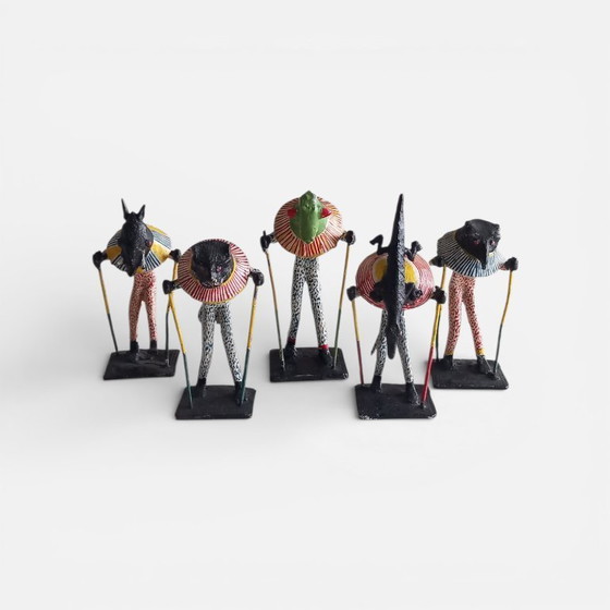 Ensemble de cinq statues figuratives africaines en métal peint à la main – têtes d'animaux – Afrique