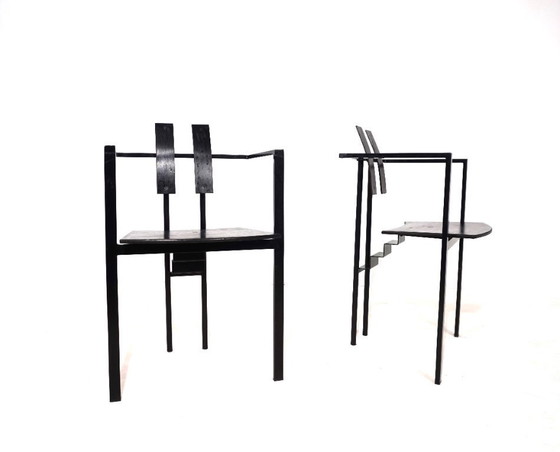 Un ensemble Trix de style Memphis se compose d'une structure en métal noir et d'une assise et d'un dossier en contreplaqué noir. La structure est en bon état, avec de légères traces d'usure, et les surfaces en bois présentent une patine élégante et discrète. L'assise repose sur la structure et est fixée par une seule vis. La structure, avec son système d'assemblage à gradins, présente l'une des caractéristiques typiques du style Memphis des années 1980. Ses lignes créent un effet extrêmement léger et intemporel.