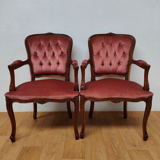 Ensemble de deux chaises et fauteuils vintage français Louis XV en bois et velours
