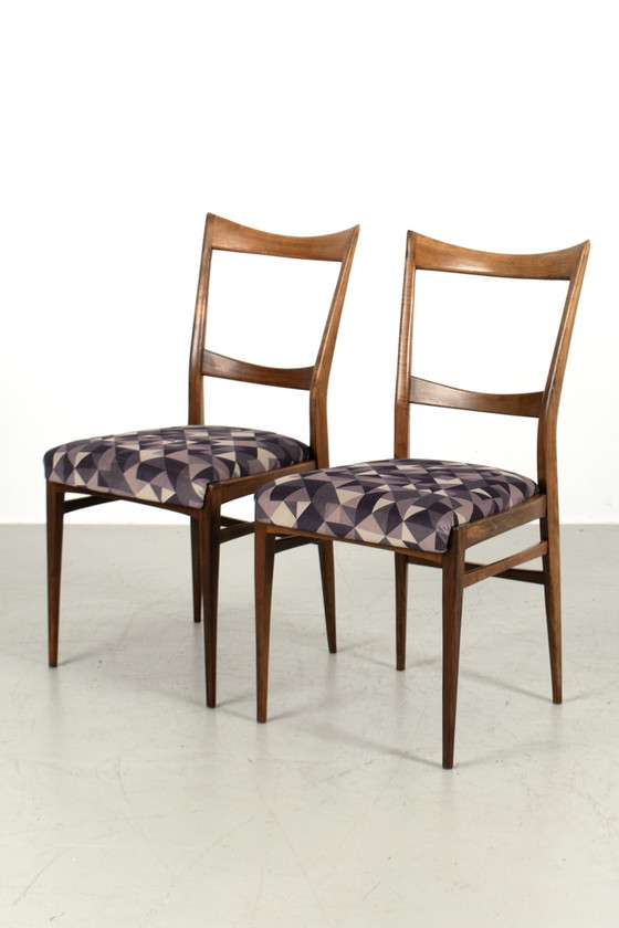 Joli ensemble de deux chaises vintage. Les chaises ont été retapissées dans un tissu graphique violet vibrant. Elles présentent quelques signes d'utilisation tels que des taches et des rayures sur les cadres en bois (voir photos). Dans un état vintage normal.