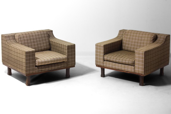 Ensemble de deux fauteuils club lounge signés Dino Cavalli, Italie, années 1970. Structure en bois au profil bas et arrondi, avec accoudoirs intégrés. Revêtement en tissu à carreaux, coussins d'assise et de dossier amovibles. Reposant sur de courts pieds en bois ornés des détails caractéristiques de Cavalli. En bon état vintage. Le tissu est bien conservé et les coussins d'assise sont confortables. Le rembourrage des accoudoirs a légèrement perdu de son élasticité.