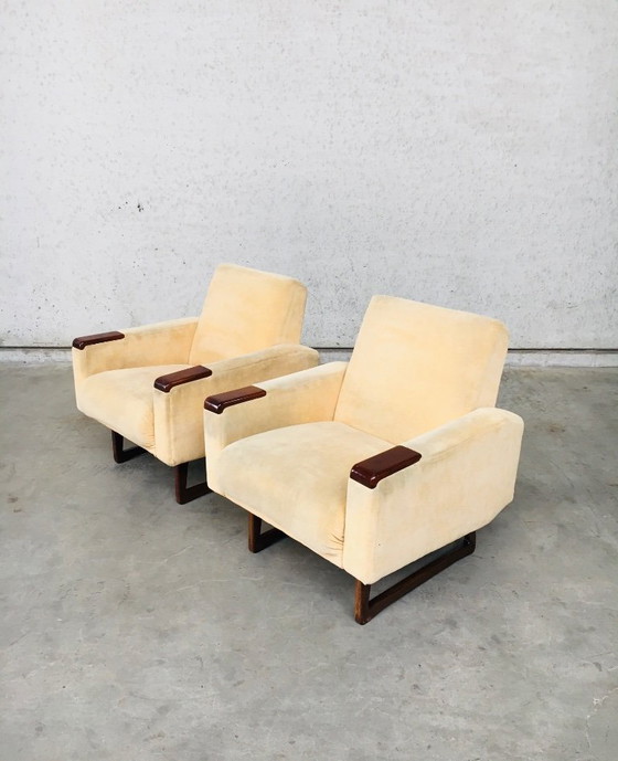 Lot de 2 fauteuils vintage scandinaves du milieu du siècle, fabriqués au Danemark dans les années 1950-60. Tissu en velours jaune pâle avec accoudoirs en bois et pieds en U. Ce fauteuil est d'origine et en bon état. Le tissu jaune pâle présente des traces d'utilisation, patiné par le temps et quelques taches. Chaque fauteuil mesure 81 cm x 75 cm x 80 cm. Vendu par lot de 2.