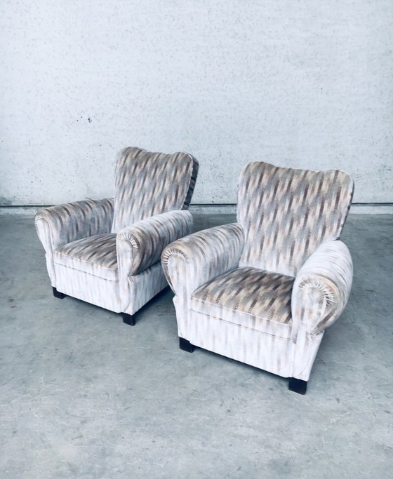 Ensemble de fauteuils de salon Art déco vintage, fabriqués en Belgique dans les années 1940. Magnifiques fauteuils aux formes harmonieuses, recouverts d'un tissu en velours OP Art, probablement non d'origine. Ils sont tous deux en parfait état. Chaque fauteuil mesure 93 cm x 93 cm x 83 cm. Vendus par lot de 2.