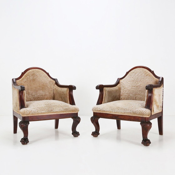 Ensemble de deux fauteuils Empire en acajou massif, recouverts de peau de mouton. Fabriqués à la main vers 1820 en France. Cet ensemble de fauteuils présente des accoudoirs sculptés à la main et des pieds en patte de lion. L'ensemble est en très bel état d'origine avec une belle patine.