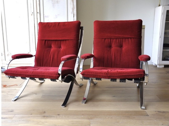 Cet ensemble de fauteuils rouges allie confort et design moderne. Les fauteuils sont recouverts d'un luxueux velours rouge et ont une structure métallique robuste. Parfaits pour un salon moderne, ils offrent à la fois style et durabilité. Les fauteuils sont en excellent état et ne présentent que des signes minimes d'utilisation sur la structure métallique.