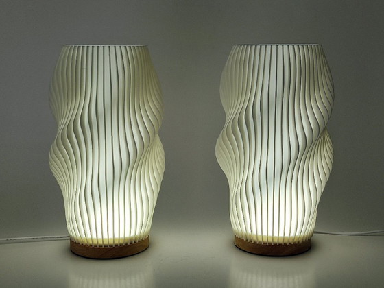 Ces lampes sont fabriquées en plastique aux formes organiques sur un socle en bois.
