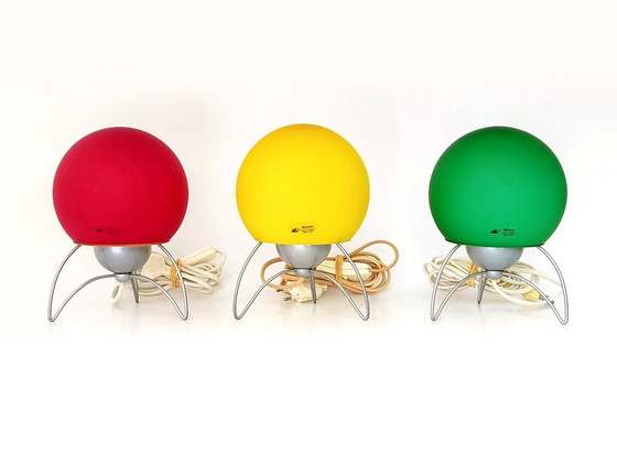 Ce modèle est composé de trois lampes : rouge, jaune et verte, sur un socle en métal gris.