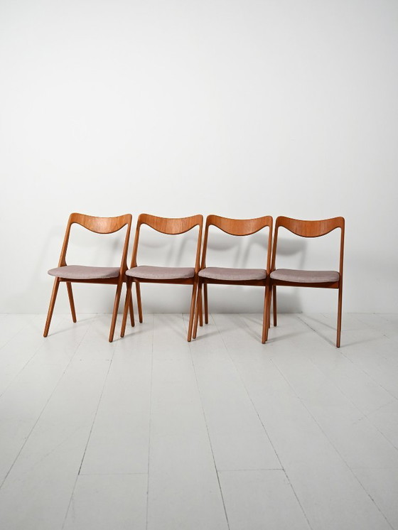 Ensemble de 4 chaises suédoises « Storken » en teck, signées Birger Höglund pour A.B. Johansson & Söner, retapissées d'un tissu gris chaud lavable.