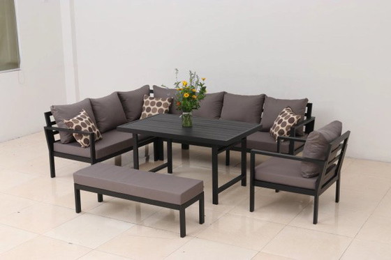 Ensemble complet de salle à manger en aluminium. L'ensemble se compose de plusieurs éléments individuels qui, ensemble, peuvent accueillir 9 personnes.