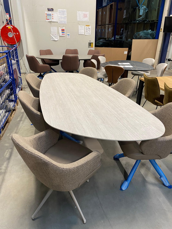Découvrez l'élégance raffinée de l'ensemble de salle à manger Bree's New World, un complément idéal pour tout intérieur moderne. Cet ensemble comprend une magnifique table Trapea au plateau en travertin aux formes organiques, disponible en largeurs de 90 à 110 cm et en longueurs à partir de 264 cm. Le piètement est subtilement assorti aux chaises, créant ainsi une harmonie visuelle.