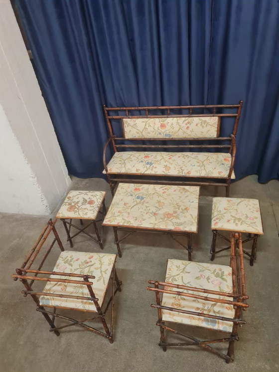 Rare ensemble de salon ancien en faux bambou fabriqué par la célèbre Maison Staněk à Prague, vers 1900. Ce magnifique ensemble comprend un banc, trois chaises et une table assortie, tous recouverts d'un charmant tissu floral typique de la fin du XIXe siècle et du début du XXe siècle.