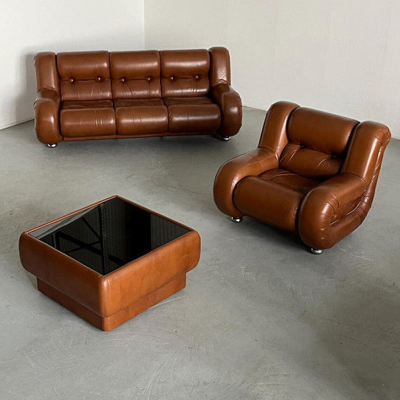 Ensemble de salon italien Space Age dans le style de Mimo Padova, cuir cognac et chrome, Italie des années 1970