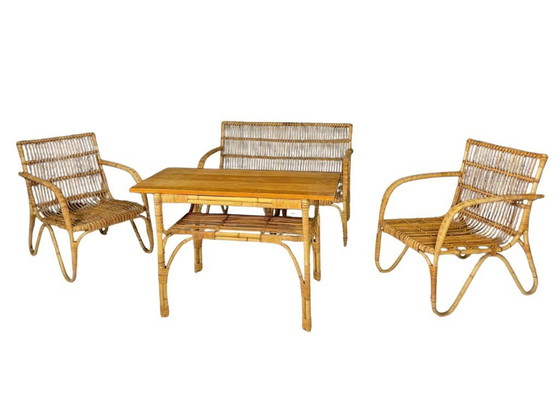 Charmant ensemble de sièges en rotin de style Art déco, produit en Europe centrale entre la fin des années 1930 et le début des années 1940. Cet élégant ensemble comprend une table, un banc à deux places et deux fauteuils. L'ensemble présente une construction tissée à la main, des lignes courbes et une silhouette à la fois douce et structurée, typique du design européen d'avant-guerre.