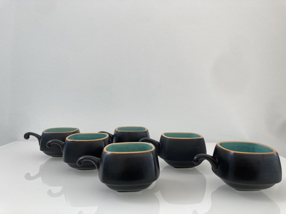Cet ensemble de six tasses à thé japonaises modernes est une belle addition à toute cérémonie du thé. Fabriquées en céramique de haute qualité, ces tasses ont un extérieur noir élégant et un intérieur bleu saisissant. Le design moderne est accentué par la forme unique et l'anse subtile, qui assure une prise en main confortable. Parfaites pour les amateurs de thé et de design japonais.
