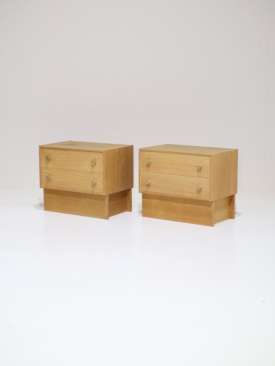Ensemble de deux tables de chevet scandinaves, années 1960/70. Ces commodes vintage proviennent du Danemark ou de Suède et sont en chêne clair. Elles possèdent des pieds originaux et chacune est dotée de deux tiroirs avec poignées rondes en bois. Ces tables de chevet minimalistes et intemporelles apporteront une touche vintage parfaite à votre chambre !