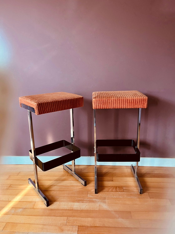 Deux magnifiques tabourets chromés, revêtus d'un velours côtelé rouge orangé clair. Très confortables, ils apporteront une touche d'élégance à votre bar.