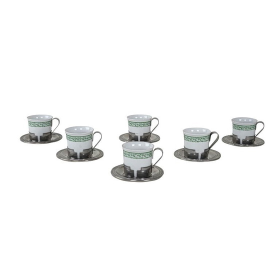 Il s'agit d'un ensemble de 6 tasses à expresso en porcelaine. Les tasses sont munies d'anses en métal et leurs soucoupes en acier inoxydable. La porcelaine est ornée d'un motif floral vert classique, typique des années 1970-1980. L'alliance de la fraîcheur de l'acier et de l'élégance du motif confère à cet ensemble un caractère intemporel, idéal pour savourer un expresso aromatique dans une ambiance rétro.