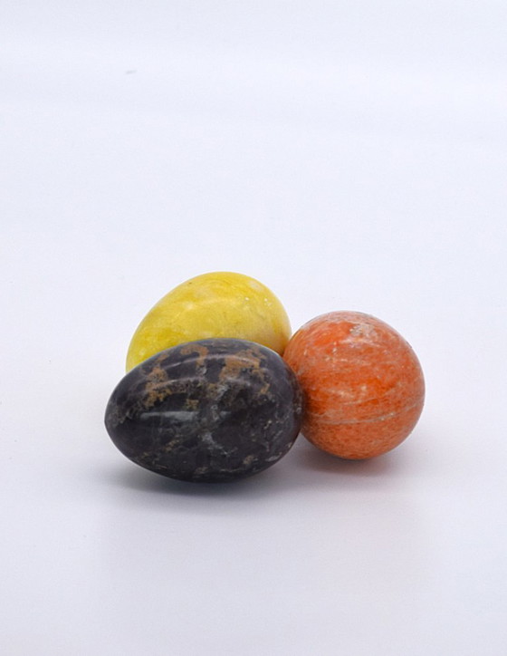 Découvrez l'élégance intemporelle de ce lot de trois œufs vintage en marbre. Chaque œuf est minutieusement façonné dans un marbre de haute qualité et dégage un charme unique qui s'intègre parfaitement aux intérieurs classiques et modernes. Les couleurs vibrantes – jaune, noir et orange – apportent une touche à la fois ludique et raffinée à votre décoration.
