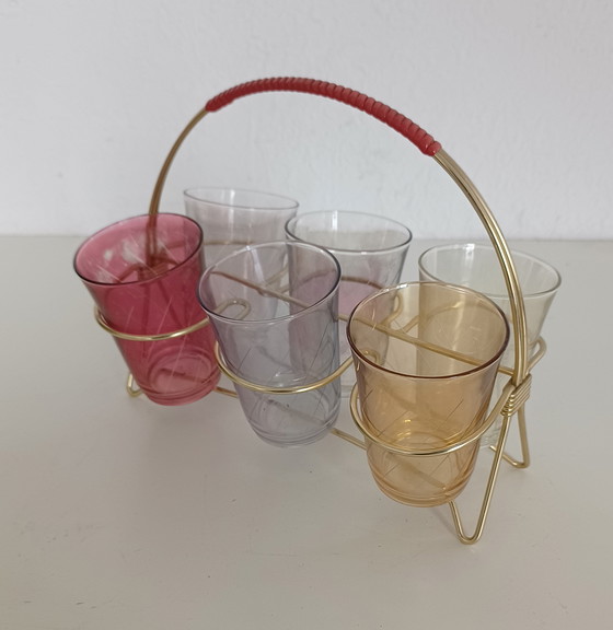 Un ensemble amusant de verres à eau des années 1950 dans un support. Un mini-bar à la maison ? Alors cet attribut ne devrait pas manquer. Excellent état, voir photos.
