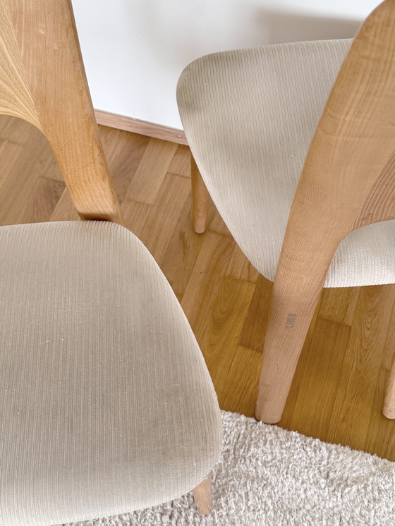 Designer : Nils Koefoed (Danemark) Fabricant : Koefoeds Møbelfabrik Période : Moderne du milieu du XXe siècle (années 1960/1970) Matériaux : Bois massif (souvent du teck, du palissandre ou du chêne), revêtement en tissu clair. L'ensemble comprend : 4 chaises de salle à manger.