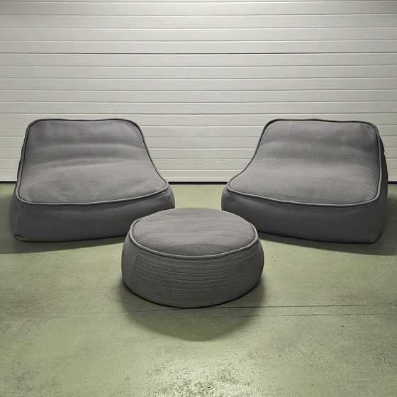 Cet ensemble se compose de deux fauteuils et d'un pouf, offrant un confort exceptionnel grâce à leur forme ergonomique et leur revêtement en textile de haute qualité.
