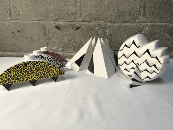 - Le service se compose de différentes formes géométriques, chacune ornée d'un motif caractéristique aux couleurs vibrantes telles que le blanc, le noir, le jaune et le rouge.