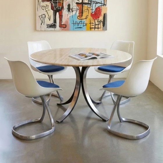 Ensemble de salle à manger, composé d'une table en marbre ronde (140cm), modèle T69 d'Osvaldo Borsani et Eugenio Gerli pour Tecno (1963), et de quatres chaises de Michel Carron (1970s).