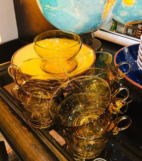 Ensemble de 6 tasses et 1 sucrier en verre translucide jaune vintage. Artisanat Pologne, années 80. Verre soufflé. Tasses aux jolies et délicates anses : Hauteur 7 cm diamètre 8,5 cm Sucrier: Hauteur 10 cm diamètre 10 cm A noter une petite anse délicate est fendue voir photo.