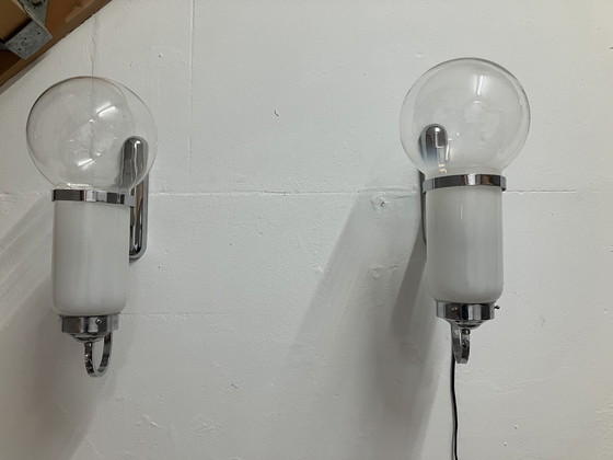 Ensemble d'appliques italiennes des années 1950/60. Magnifiques grandes lampes murales dont l'abat-jour est entièrement fait de verre fait à la main, avec une partie de verre opale blanc et une partie de verre clair. La lumière est projetée vers le haut depuis le bas et a un effet stupéfiant ! Ce type de lampe a probablement été fabriqué par Foscarini, mais il n'y a plus d'étiquette ou d'autocollant. L'âge est visible sur les lampes et les supports où il y a des fissures dans le matériau jour le cadre est décoré (le cadre de support est en fer chromé et n'est manifestement pas cassé). Dans l'ensemble, un ensemble extraordinaire de lampes que vous ne verrez pas une deuxième fois ! Les vis du support ne sont pas les mêmes mais vous pouvez les remplacer par des vis chromées ou plus foncées.