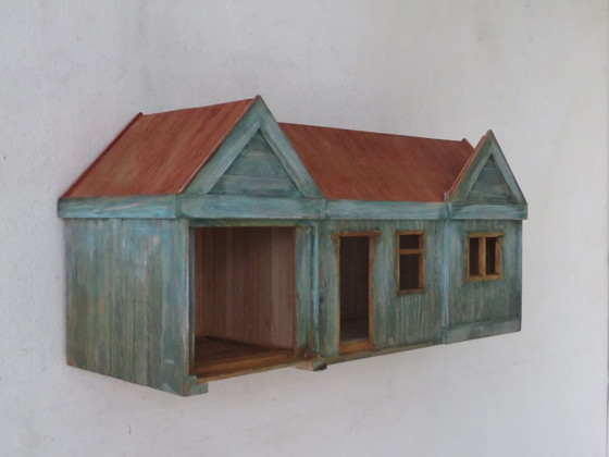 Sculpture murale originale en bois peint. (Note : L’œuvre mesure 19 cm de profondeur.) L’artiste est Eric van Solm. Formation : Willem de Kooning Rotterdam, 1980-1985, Département de design plastique et spatial. Inscrit au R.K.D.