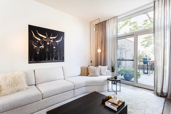 Découvrez le raffinement du canapé d'angle Manuel Larraga, un chef-d'œuvre de design moderne qui allie harmonieusement élégance et confort. Revêtu d'un textile doux couleur crème, ce canapé d'angle offre une allure accueillante et luxueuse qui s'intègre parfaitement à tout intérieur contemporain.