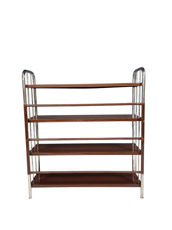 Cette élégante étagère de style Bauhaus date des années 1930 et a été fabriquée en Europe. Avec sa construction minimaliste en acier chromé plié et ses étagères en tôle, elle présente les lignes épurées et le fonctionnalisme typiques du design Bauhaus. Une pièce intemporelle qui convient aussi bien aux intérieurs vintage que contemporains. La pièce est en très bon état, avec seulement une légère courbure le long du bord de l'étagère supérieure - rien qui n'affecte la fonctionnalité ou la valeur esthétique.