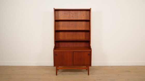 Magnifique armoire haute des années 1960, d'origine danoise, conçue par Johannes Sorth. Ce meuble vintage est doté de trois étagères supérieures aux finitions soignées et de deux portes coulissantes inférieures. Cette bibliothèque vintage est réalisée en placage de teck aux tons chauds et repose sur un piètement en chêne. La finition de cette armoire haute vintage est remarquable ; admirez par exemple les poignées ! Un meuble multifonctionnel idéal pour ranger vos livres, vos jeux et exposer vos plus beaux objets.