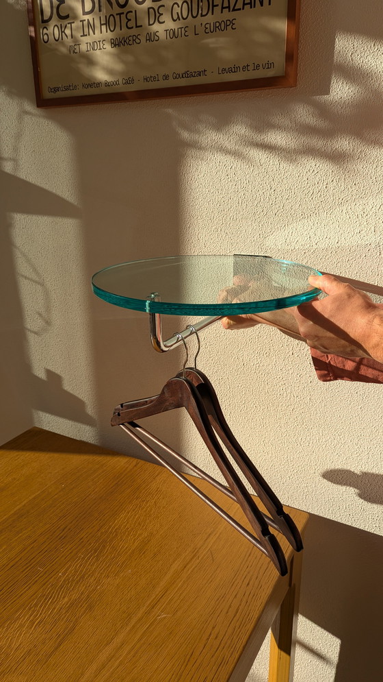 Un design minimaliste et sculptural associant une étagère circulaire en verre à une structure métallique et cinq patères intégrées – idéal pour une entrée ou un couloir.