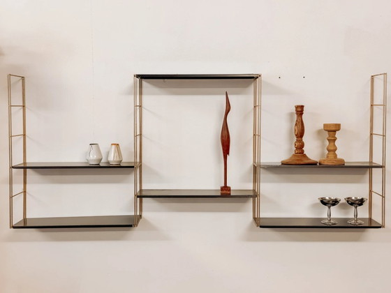 Étagère murale String, France, années 1960. Elle se compose de 4 montants dorés et de 6 étagères en métal noir.