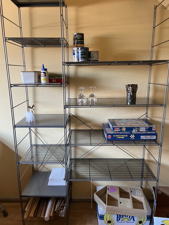 Étagère conçue par Niels Gammelgaard pour IKEA dans les années 1980. Ce système complet et original se compose d'étagères en fil métallique et en verre, intégrées à une élégante structure en acier gris avec ses croisillons caractéristiques. Un bel exemple du design fonctionnel et minimaliste qui a fait la renommée de Gammelgaard.