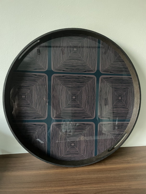 Ce plateau Ethnicraft est un objet décoratif de belle facture, doté d'un design moderne et d'un motif géométrique saisissant. Fabriqué en bois et en verre de haute qualité, il allie fonctionnalité et esthétique. Les tons sombres de noir, de bleu et de marron font de ce plateau un objet polyvalent qui peut s'intégrer à différents styles d'intérieur. Idéal pour le service ou comme pièce maîtresse décorative. 48 cm de diamètre, 4,5 cm de profondeur