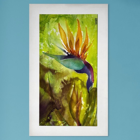 Cette aquarelle représente une fleur d'oiseau de paradis stylisée. La composition met l'accent sur le rythme expressif des pétales et des feuilles allongés, rendus par des lavis fluides de vert, d'ocre et de bleu profond. La forme de la plante est simplifiée et légèrement abstraite, privilégiant le mouvement et l'équilibre plutôt que les détails botaniques.