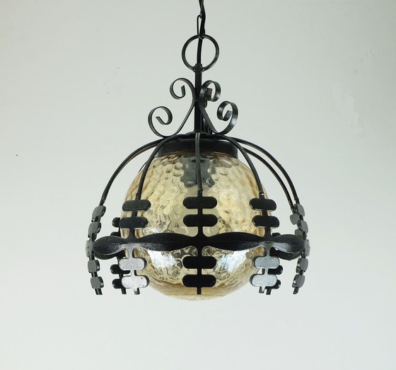 Magnifique suspension des années 1970. Étiquette du fabricant : ME. Abat-jour en verre ambré texturé. Structure en fer. Câble électrique et rosace noirs. Compatible avec une ampoule E27 (non fournie).